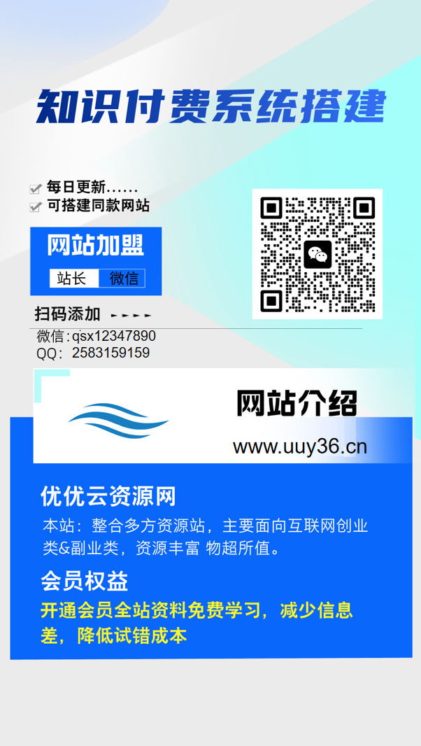 加盟优优云网创,加盟搭建同款知识付费资源网站,实现长期稳定被动收入~